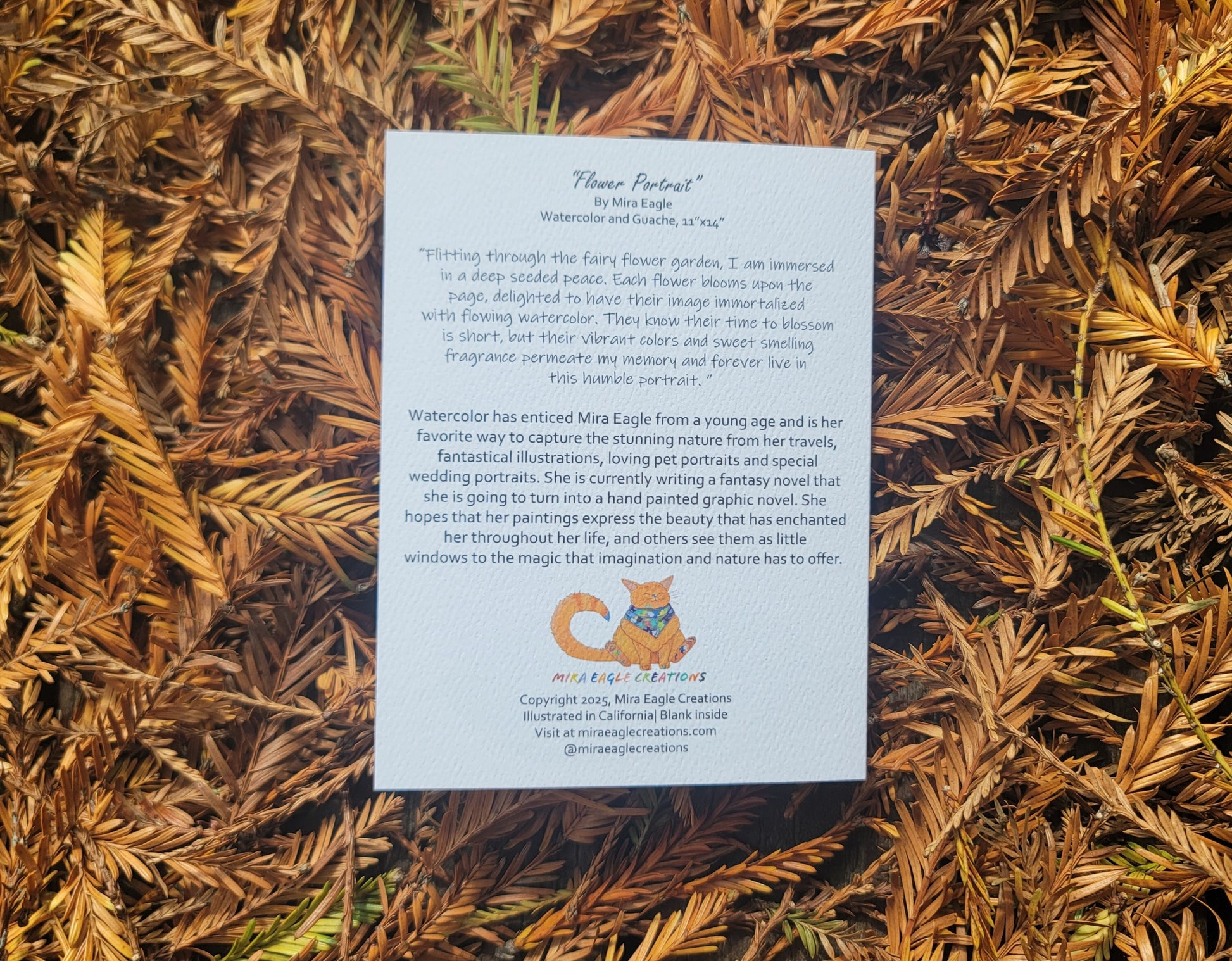“Flitting through the fairy flower garden, I am immersed in a deep seeded peace. Each flower blooms upon the page, delighted to have their image immortalized with flowing watercolor. They know their time to blossom is short, but their vibrant colors and sweet smelling fragrance permeate my memory and forever live in this humble portrait. ”