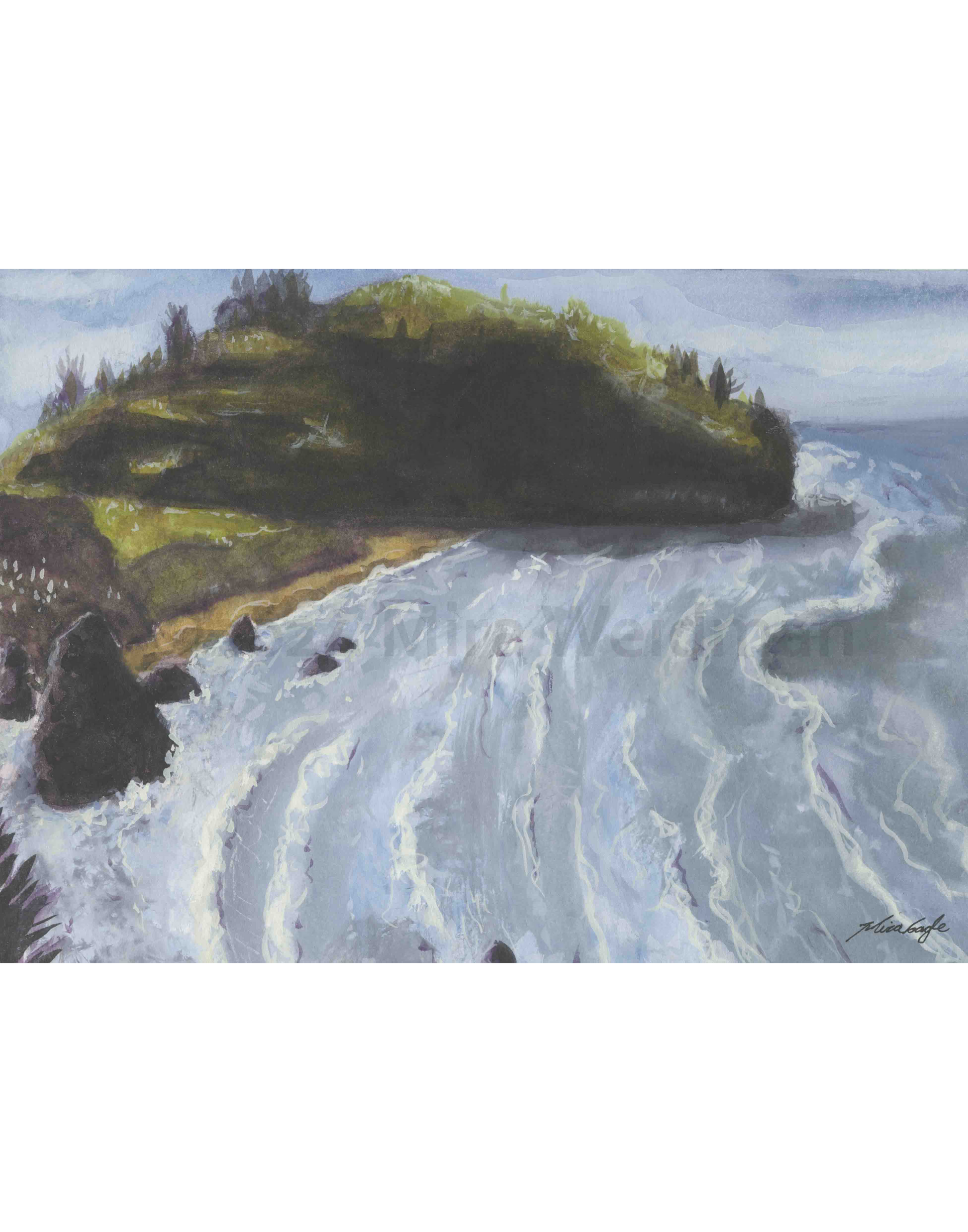 "While hiking through the forest I traipsed through lush green brush and burst through to this stunning view of the ocean. I became so enticed by the view, I had to capture the beauty in front of me. The vibrant blue in contrast with the deep greens and blacks made me feel like the painting was going to come alive and drift off the page."
