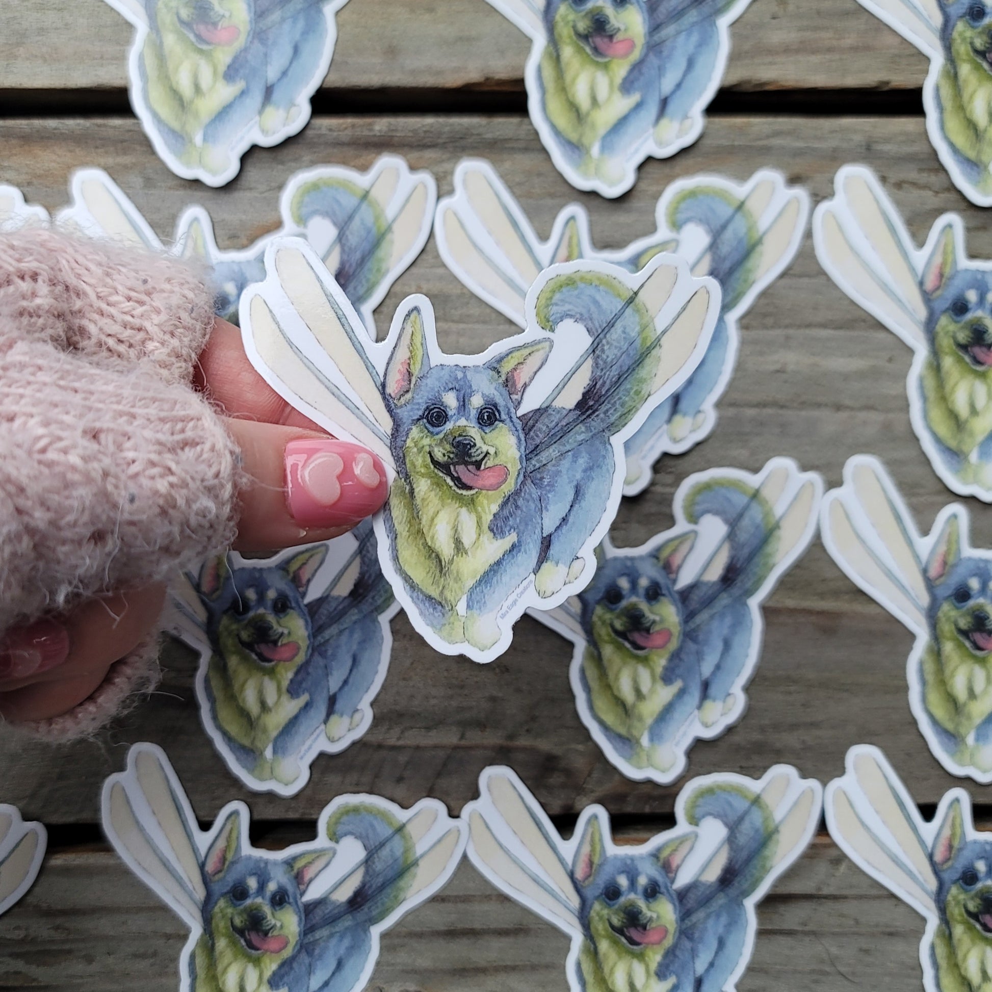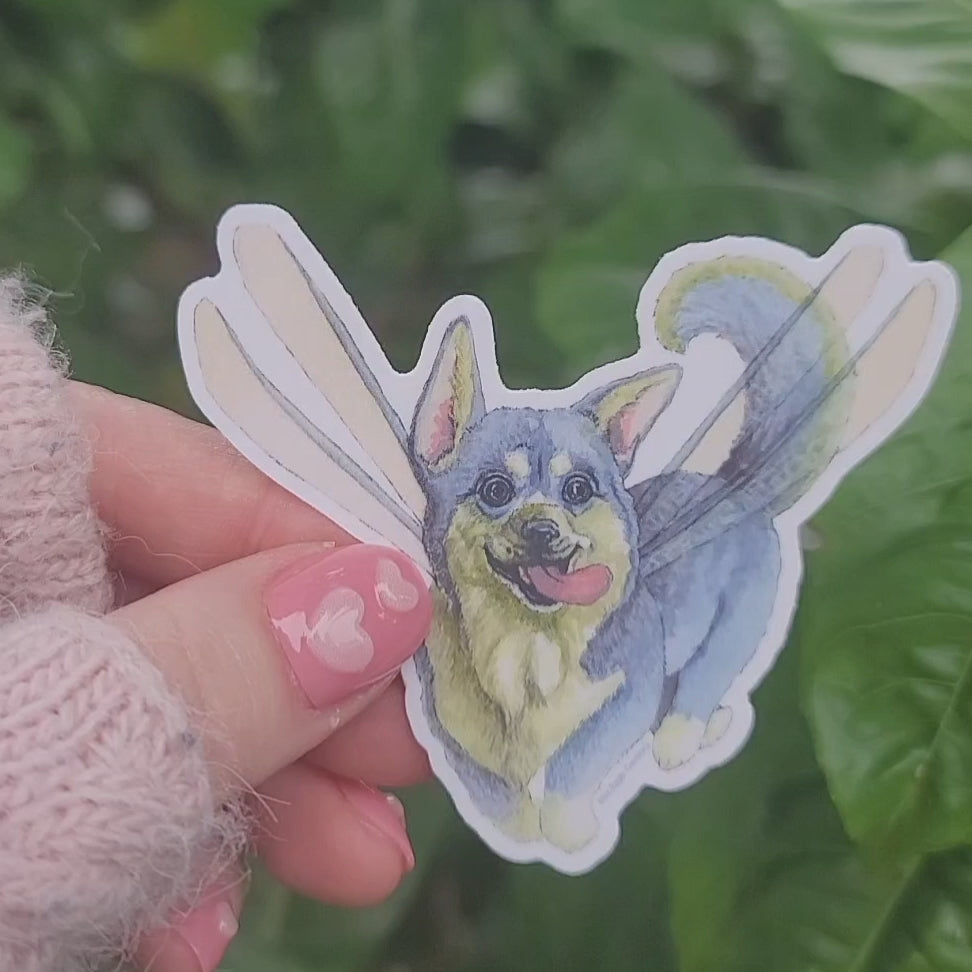 This illustrated Vinyl sticker captures a curious Pupoon, Puppers, mid-flight. Lovingly hand-painted in watercolor and printed on 3" x 2.64" Vinyl sticker. It’s part of my 2025 Autumn & Winter Whimsy Collection.