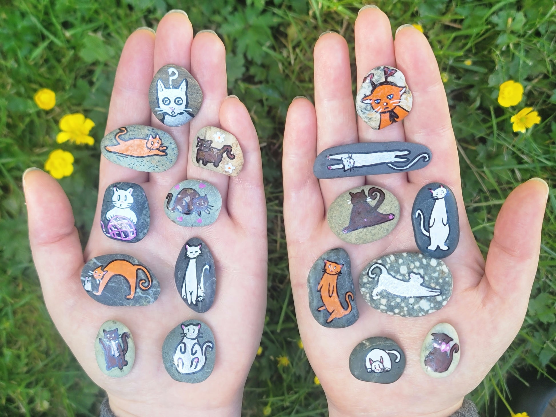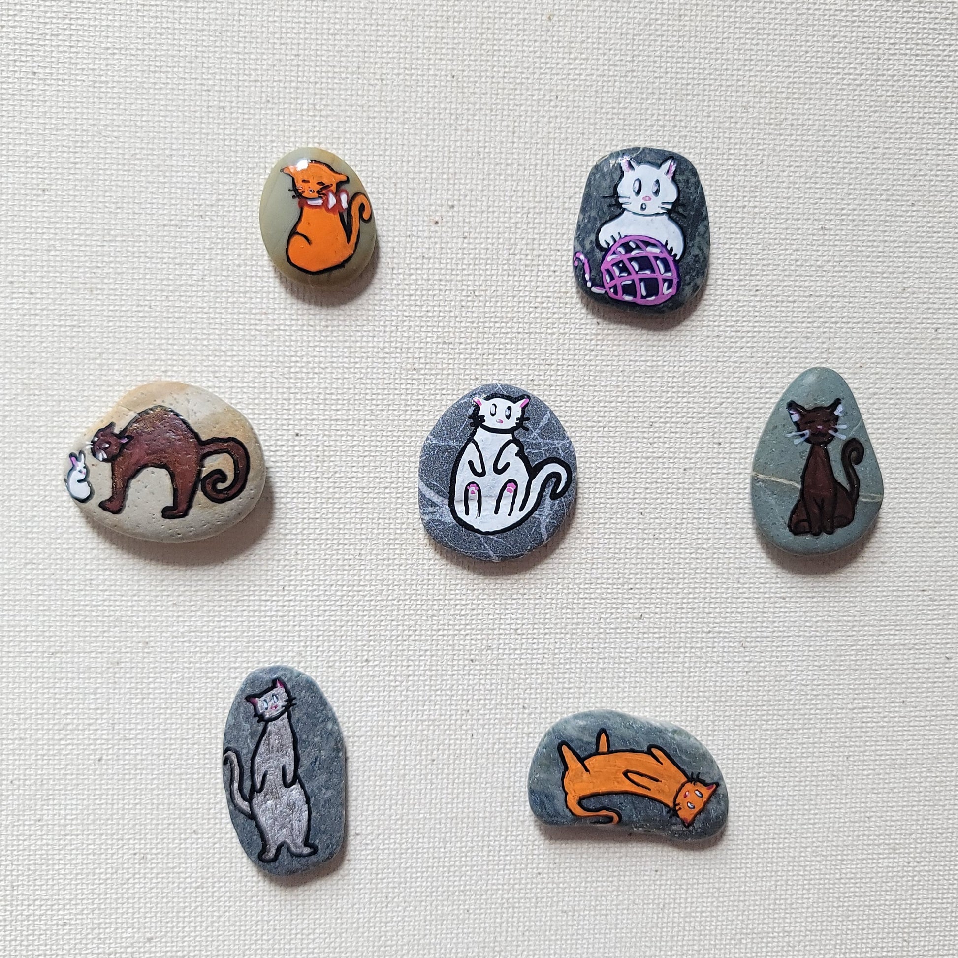 Each Mystery Pocket Familiar is a one-of-a-kind beach stone, carefully collected from local shores and chosen for its smoothness, shape, and color. I then bring each pebble to life with waterproof, oil-based paint pens—drawing tiny, detailed kitties being their fabulous, mischievous selves.